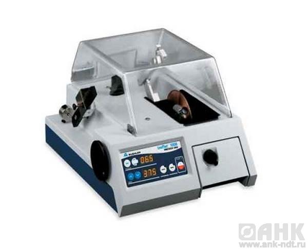 Станок IsoMet 1000 также относится к разряду бюджетных. В сравнении с предыдущей моделью скорость вращения диска увеличена до 975 об/мин. Режущее усилие создаётся посредством рычага с навесными калиброванными грузиками, но сам рычаг вынесен из зоны резки на свободную левую сторону станка. Расположенный в передней части выдвижной лоток открывает доступ к бачку для охлаждающей жидкости и системе фильтрации. Управление станком электронное, цифровая сведодиодная индикация отображает скорость диска и текущую позицию. Глубина реза устанавливается оператором. По окончании резки или по прохождении заданной длины реза автоматика выключает диск. Поперечное перемещение образца для установки толщины реза осуществляется цифровым микрометром. Брызгозащитный кожух закрывает всю верхнюю часть станка и является частью конструкции.